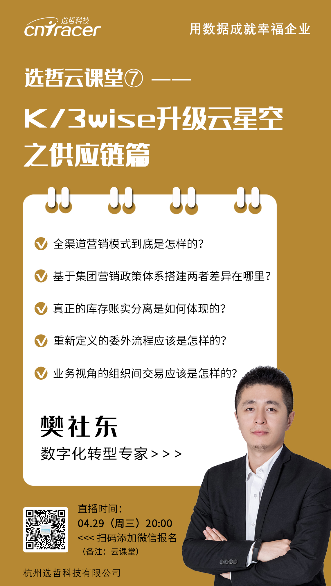 4月29日(下周三)晚上20:00,选哲云课堂⑦K/3wise升级云星空之供应链篇与您不见不散。